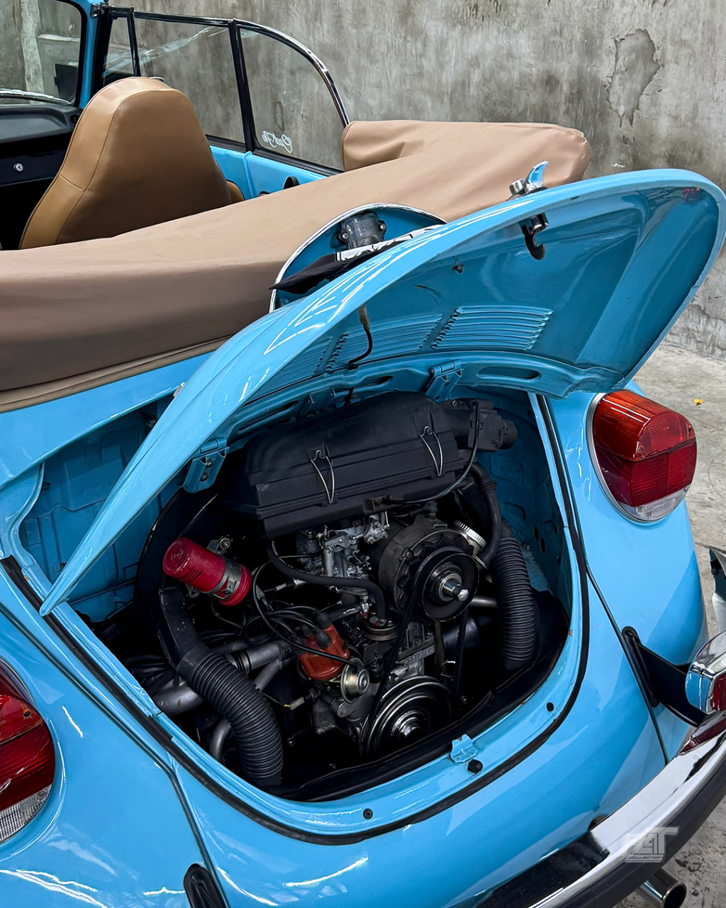 Volkswagen Cabriolet 1303 – 1973 | 1600cc Exemplar conversível alemão, tapeçaria customizada em azul e bege, capota bege e volante original de VW 412 e alavanca de engate rápido Flat4. Mantém diversos itens originais de época, como relógio VDO, rádio, painel completo e lanterna e faróis de milha Hella, além de luz de freio Bosch.